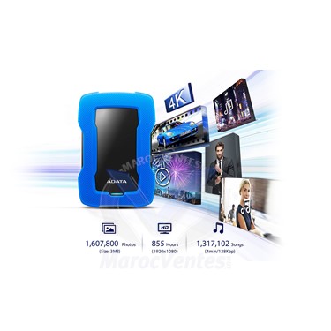 Disque dur externe HD330Incroyablement solide.Bénéficiant d'une capacité pouvant atteindre 4 To, le disque dur externe ADATA HD330 protège vos données, de l’extérieur grâce à son boîtier en silicone et aux détecteurs de chocs exclusifs d'ADATA et de l’intérieur via le logiciel Backup ToGo. Cependant, malgré sa durabilité, le HD330 conserve un facteur de forme mince de 23,4 mm* agréable à regarder et facile à transporter.Défense extérieure solideLes défenses solides du HD330 commencent à l'extérieur avec un robuste boîtier en silicone absorbant les chocs et capable de résister aux coups, aux chutes et aux chocs de la vie quotidienne.Plus d'espace pour vos sauvegardesÀ l'ère des contenus vidéo haute définition, vous n'avez jamais trop d'espace de stockage. Avec une capacité pouvant atteindre 4 To, le HD330 vous permet de sauvegarder facilement l'ensemble de votre musique, de vos films, de vos photos et plus encore.Maintenez à distance les erreurs et les secteurs défectueuxLes lecteurs externes de moins bonne qualité continuent de fonctionner même lorsqu'ils tombent ou subissent un choc, ce qui entraîne des erreurs et des secteurs défectueux. Avec les détecteurs de chocs exclusifs d'ADATA, l'ensemble de l'activité du lecteur s'arrête lorsqu'un choc physique est détecté. Une fois à l'abri, l'activité reprend. Vous êtes pleinement informé grâce à l’indicateur de statut clair.Utiliser avec votre console de jeuxLe HD330 peut être connecté à des consoles de jeux et utilisé en tant que stockage de sauvegarde pour les jeux qui ne sont pas en cours d’utilisation.* Les temps de chargement réels peuvent varier en fonction des jeux. Il se peut qu’un formatage soit requis pour que le HDD externe fonctionne avec les consoles de jeux.** La prise en charge des appareils de stockage externes peut varier en fonction des consoles de jeux. Veuillez cliquer ici pour plus d'informations.Logiciel de sauvegarde intelligent de Backup ToGoBackup ToGo utilise un algorithme pour sauvegarder toutes vos données de façon intelligente et facile. Définissez vos calendriers de sauvegarde désirés et ne vous inquiétez plus jamais de pertes de données ! De plus, Backup ToGo dispose d’une fonction de sauvegarde dans le cloud, qui prend en charge la sauvegarde dans le cloud, sur des disques durs locaux, et même sur des appareils mobiles. Avec Backup ToGo, les utilisateurs peuvent profiter d’un outil doté d’une interface intuitive qui permet la sauvegarde en un clin d’oeil !Caractéristiques Techniques