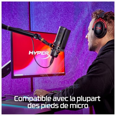Grand condensateur pour une excellente performance sonoreLa conception du ProCast permet d'obtenir une meilleure précision dans les hautes fréquences par rapport aux microphones à électret et dynamiques, et d'améliorer les performances dans les basses fréquences par rapport aux condensateurs à petit diaphragme.Configuration polaire cardioïde pour l'enregistrement soloLa configuration polaire cardioïde accentue les sons à l'avant du micro, ce qui le rend parfait pour les voix off, le streaming, les voix, les podcasts ou tout autre enregistrement audio à source unique.Connexion XLR de qualité professionnelleLe ProCast nécessite une alimentation fantôme de 48 V, alors connectez-le via un câble XLR à des interfaces professionnelles ou à des préamplis pour démarrer votre enregistrement.Filtre amovible HyperX Shield inclusIl suffit de fixer le filtre HyperX sur le support antichoc inclus du ProCast pour filtrer les bouffées d'air plosives qui résultent des sons p.Support anti-vibration intégré