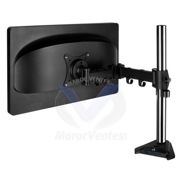 * Nombre d'écrans supportés : 1* Supporte les écrans ultra-larges jusqu'à 49"* Supporte les écrans standards 16:9 jusqu'à 43"* Inclinaison : +/- 15 °* Pivot : 180°* Rotation : 360°* Montage VESA : 75 / 100* Poids maximum : 15 kg par bras* Hub USB 3.0 4 ports* Simplicité de mise en place* Épaisseur max du bureau : ≤ 65 mm - Plus d'images (4)