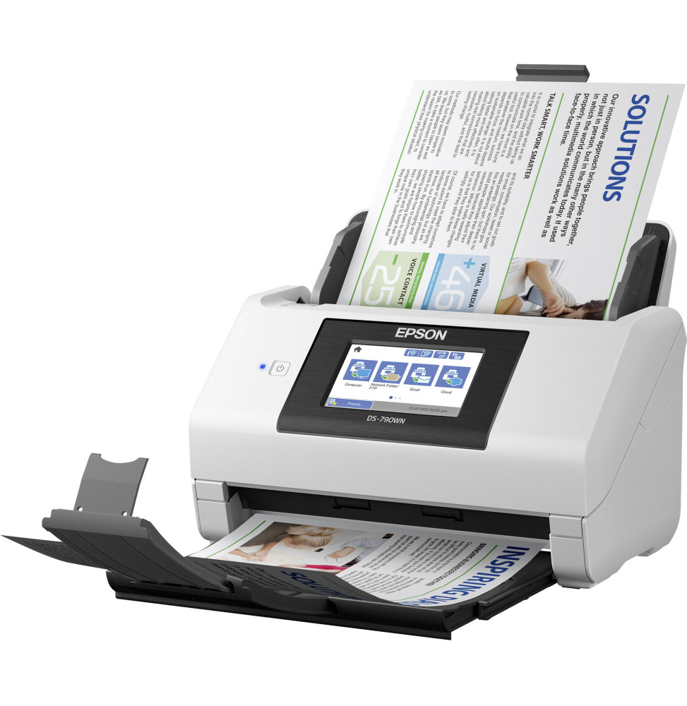 Epson Scanner WorkForce DS-790WN à Défilement Recto-verso Automatique. Résolution optique maximale: 600 DPI (ppp) x 600 DPI (ppp) (horizontal x vertical). Taux d'utilisation: 7.000 pages Connectivité: Wi-Fi Direct, Port USB, Interface Ethernet (1000 Base-T/ 100-Base TX/ 10-Base-T), Wi-Fi b/g/g 25 GHz, USB 3.2 Gen 1x1. Ecran tactile de 10,9 cm (Epson B11B265401BA)
